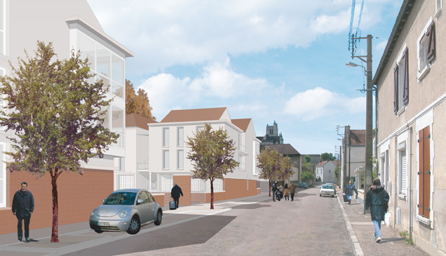 Le terrain est situé sur la rive droite de l’Yonne à proximité de l’avenue Jean Jaurès sur l’emprise d’une ancienne usine avec une façade sur la rue Camille Desmoulins de 75 mètres environ, offrant une perspective sur la Cathédrale d’Auxerre. « Petits immeubles collectifs et jardins cohabitent»: L’objectif étant, tout en conservant un cadre champêtre, d‘éviter l’aspect de la cité HLM avec un habitat collectif dense, afin de proposer un ensemble immobilier où cohabitent des petits immeubles collectifs et jardins, et de favoriser ainsi l’insertion du projet dans le quartier existant. Ce dispositif rappelle l’échelle des maisons voisines avec leurs cours. La cours et les jardins sont délimités par des grilles suivant l’alignement des façades sur rue, et sont été traités comme un lieu de cheminement agréable par son caractère de transition entre la rue et le logement. Cette opération neuve de logements, conduite par l’Office, doit permettre d’illustrer la politique de renouvellement urbain «à visage humain» lancée par la ville pour revitaliser ce quartier en douceur. |