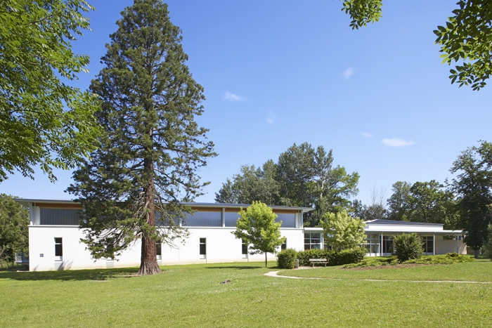 La localisation du projet dans le vaste parc public de la commune et l’accès depuis l’avenue de la gare servent de base pour la réflexion sur l’organisation et l’implantation de notre projet. Nous proposons : - De situer le volume du gymnase en retrait de l’Avenue de la Gare en l’éloignant du mur de clôture pour préserver la masse boisée de l’ancien parc du château. - De placer le gymnase perpendiculairement à l’avenue pour minimiser l’impact visuel du projet depuis l’entrée du bourg. La perception du projet depuis le parc nécessite de trouver une volumétrie avec une toiture discrète pour la grande salle. La toiture à deux pentes avec faîtage et à faible pente permet d’atténuer et d’adoucir la masse générale de la grande salle, visible depuis le parc public. La présence du gymnase dans le parc constitue un élément fort pour l’animation future du parc. |