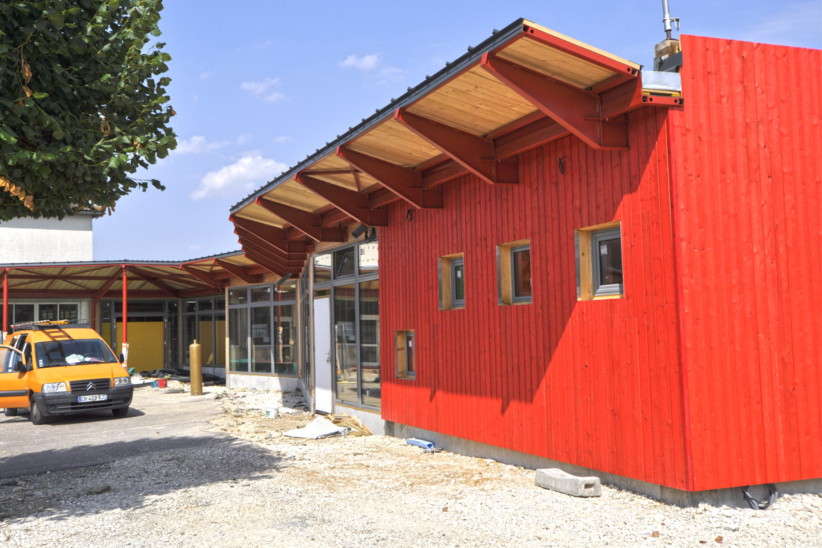 La future extension sera réalisée à ossature bois avec isolation thermique et phonique incorporées; posée sur un dallage béton. Les toitures seront végétalisées. Les toitures principales descendront en pente douce en direction de la cour de l'école offrant ainsi aux élèves leurs végétations. Les huisseries des grands ensembles vitrés seront métalliques;  les bardages des façades en bois.